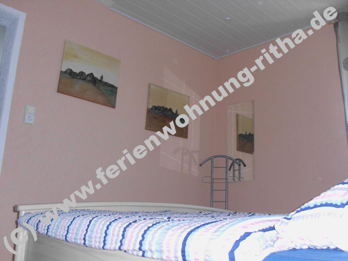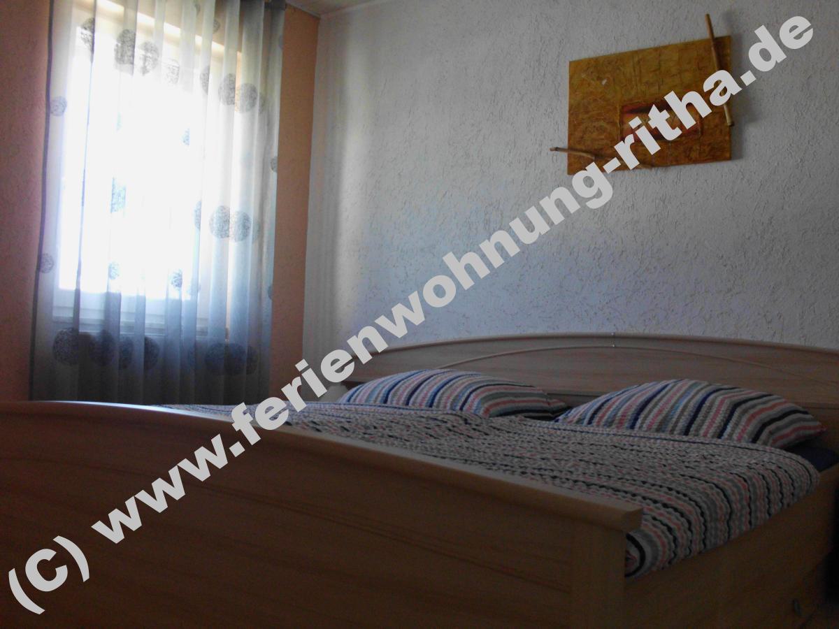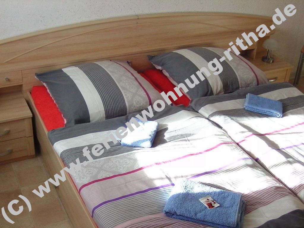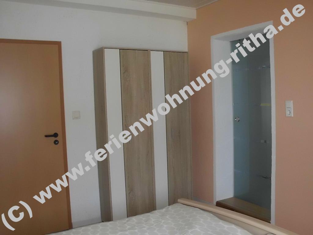 Schlafzimmer mit Doppelbett, Kleiderschrank und Stauraum in der Ferienwohnung Ritha