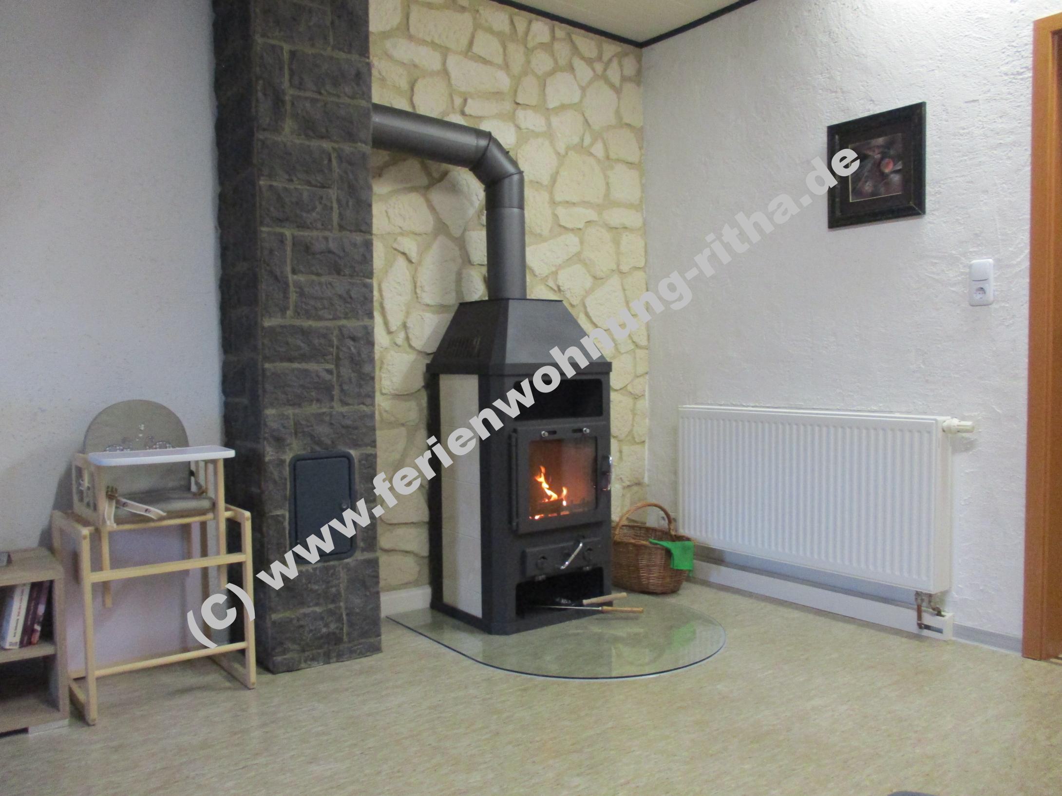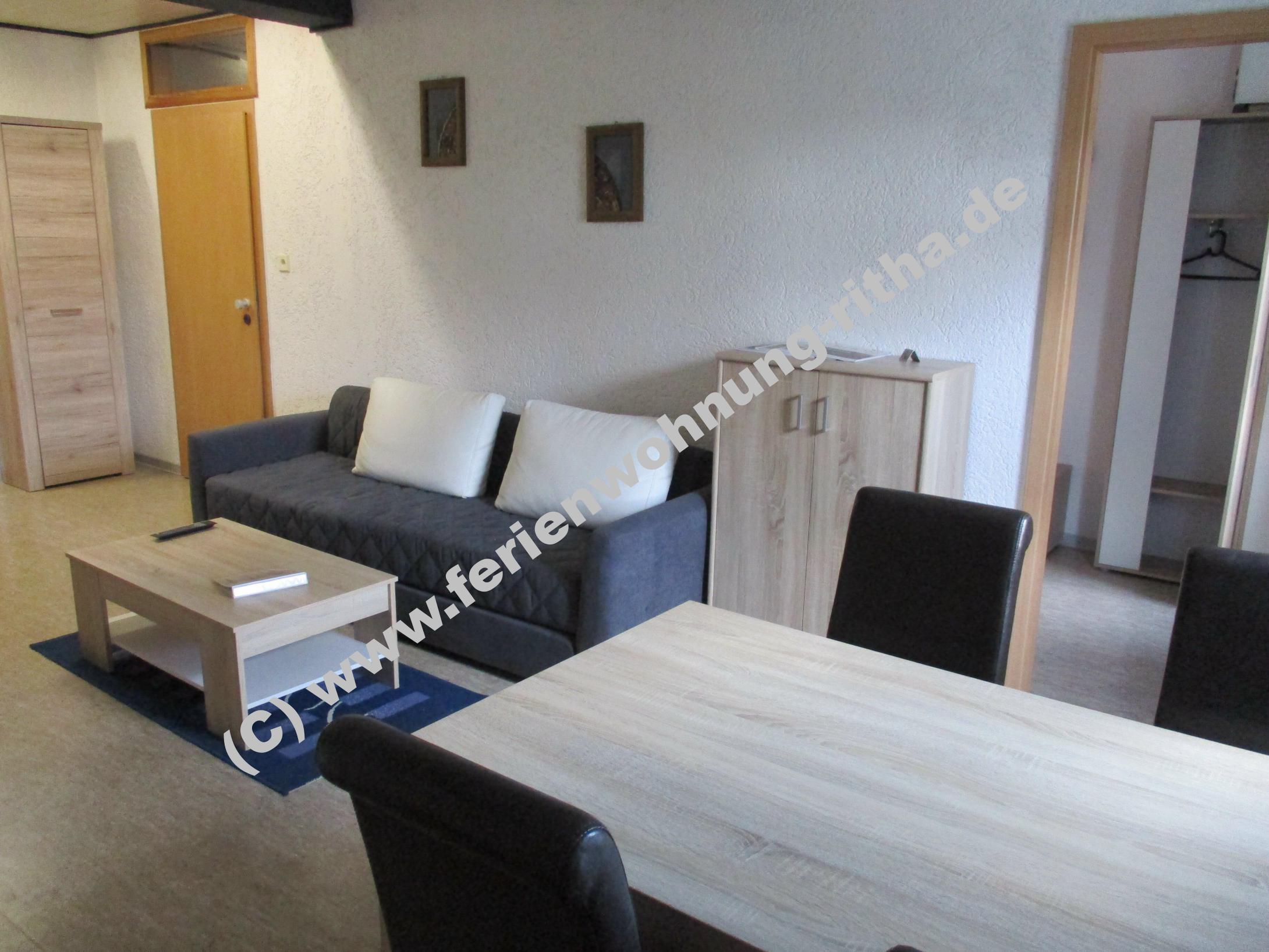 Wohnzimmer und Essbereich mit ausziehbarer Schlafcouch, geräumigem Eßtisch und Kaminecke in der Ferienwohnung Ritha