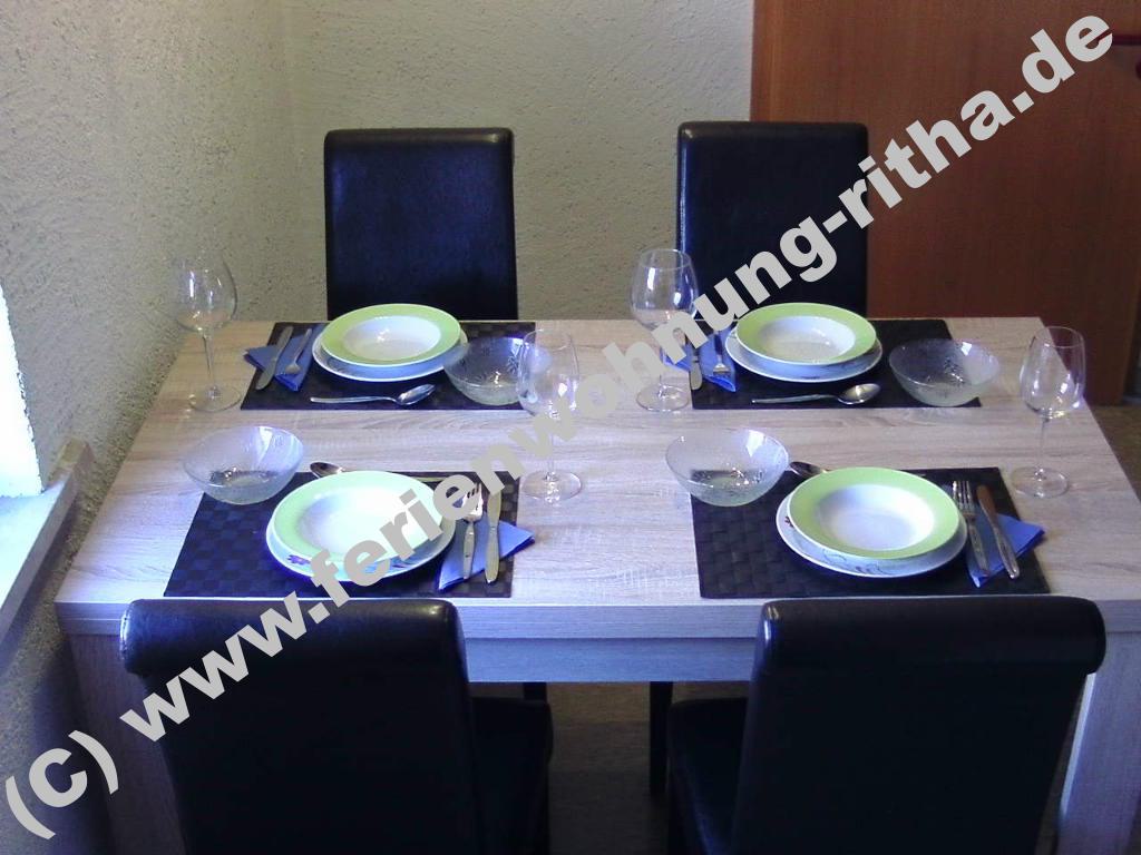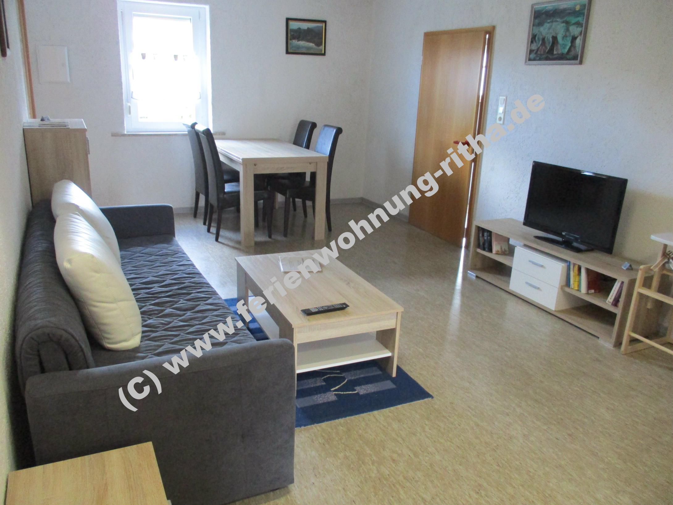 Wohnzimmer und Essbereich mit ausziehbarer Schlafcouch, geräumigem Eßtisch und Kaminecke in der Ferienwohnung Ritha